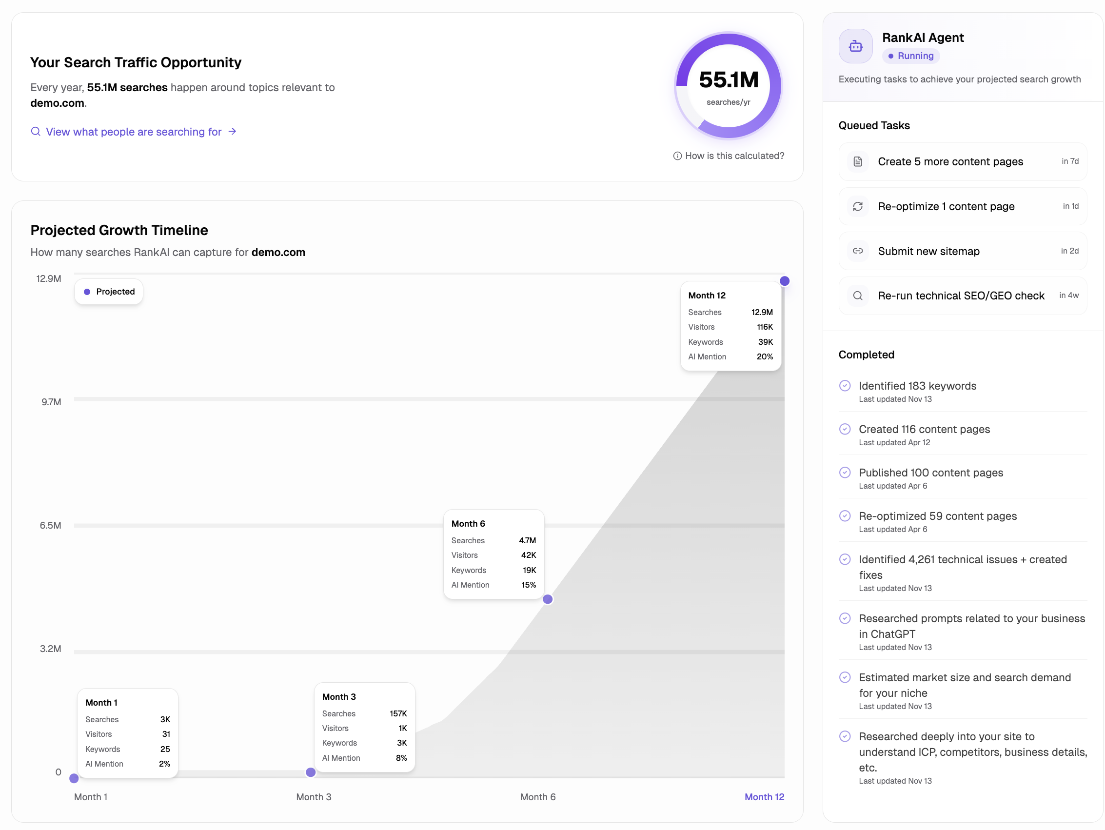 RankAI researches your business and projects the search opportunity. Then it executes actions to capture this traffic.
